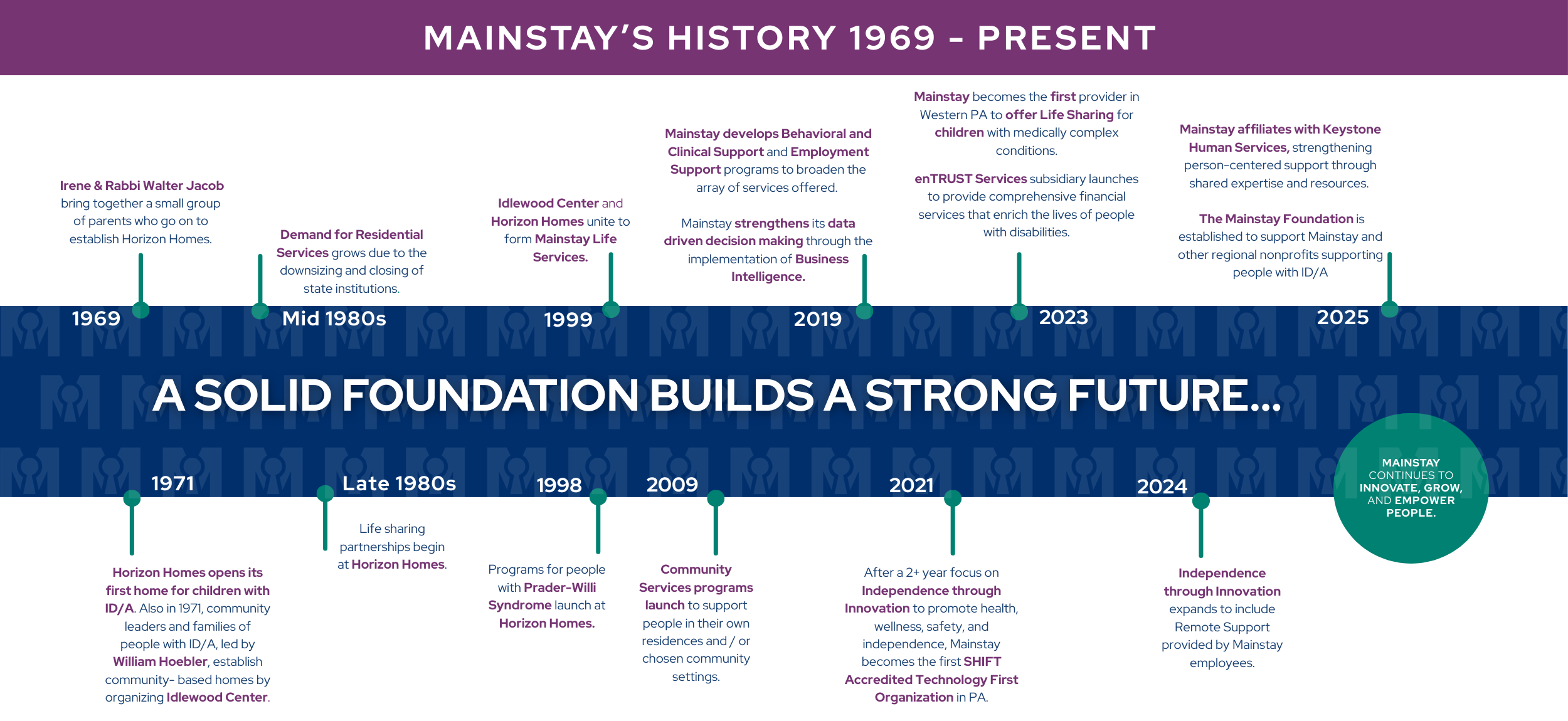 Horizon and Idlewood were pioneers in developing services for people with ID/A in Allegheny County. In the mid-1980s, both experienced a marked increase in demand for residential services due to the downsizing and eventual closing of state institutions. In 1999, Idlewood and Horizon united to form Mainstay Life Services. This produced a larger organization with an enhanced organizational capability and capacity.