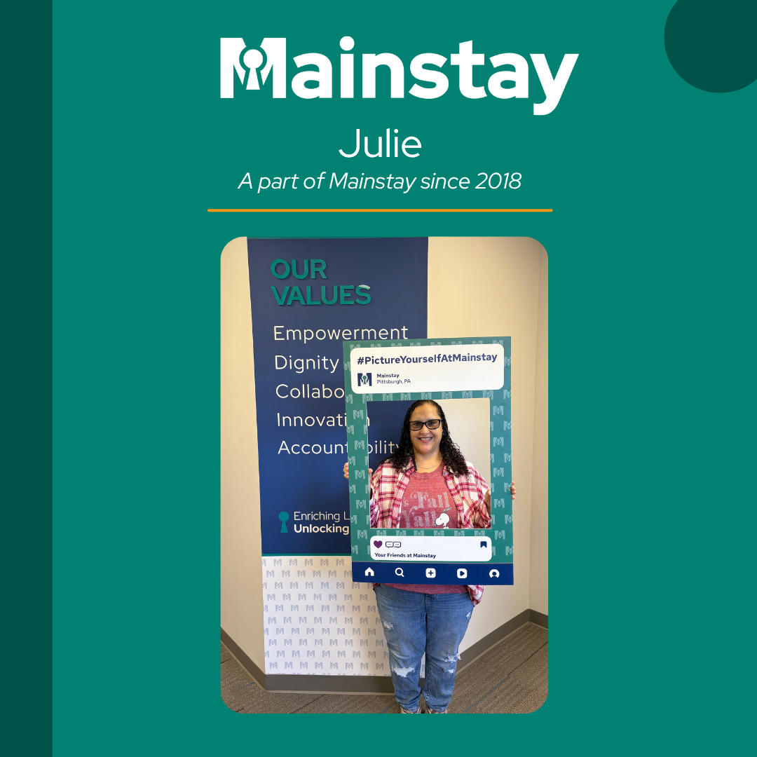 "When I first joined Mainstay I kept hearing about all the wonderful things that go on. I never would have imagined myself here 7+ years later. Mainstay provides so many opportunities for the people we support and staff to do. From participating in bowling leagues to trips to the zoo, to Kennywood, and picnics. Mainstay always has something fun going on. Assisting people in their homes gives me the chance to help them on a daily basis. You get to see how much of an impact you can really make in one's life. If you are looking for a challenging, rewarding career, Mainstay is where it's at!"